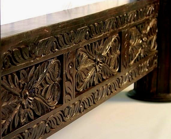 Our stylish Carved Lotus Pillar Bed features an inspired symmetrical hand carved lotus flower headboard, framed by thick carved pillars. The lotus flower has long been recognized as a spiritual symbol of iconic beauty and purity. The lotus headboard and carved footboard are both flanked by 8"-thick solid wood pillars. The pillars are carved with geometric and floral designs and take 9 months to carve and cure. The beds are handmade in a village in northern India by a family of master craftsmen who have passed on their skills for generations.
