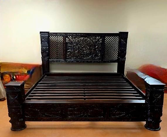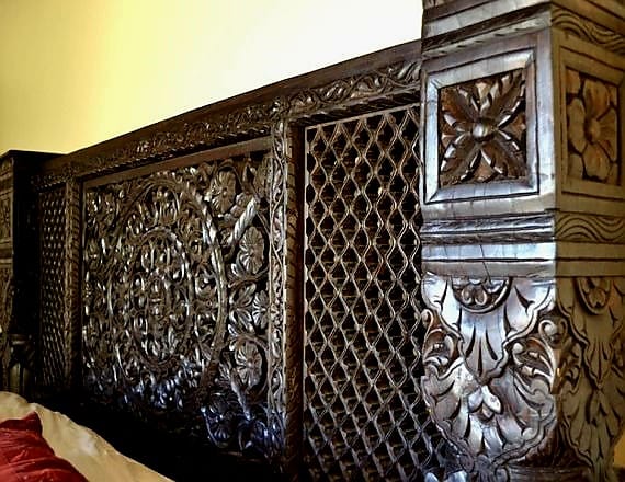 Our stylish Carved Lotus Pillar Bed features an inspired symmetrical hand carved lotus flower headboard, framed by thick carved pillars. The lotus flower has long been recognized as a spiritual symbol of iconic beauty and purity. The lotus headboard and carved footboard are both flanked by 8"-thick solid wood pillars. The pillars are carved with geometric and floral designs and take 9 months to carve and cure. The beds are handmade in a village in northern India by a family of master craftsmen who have passed on their skills for generations.