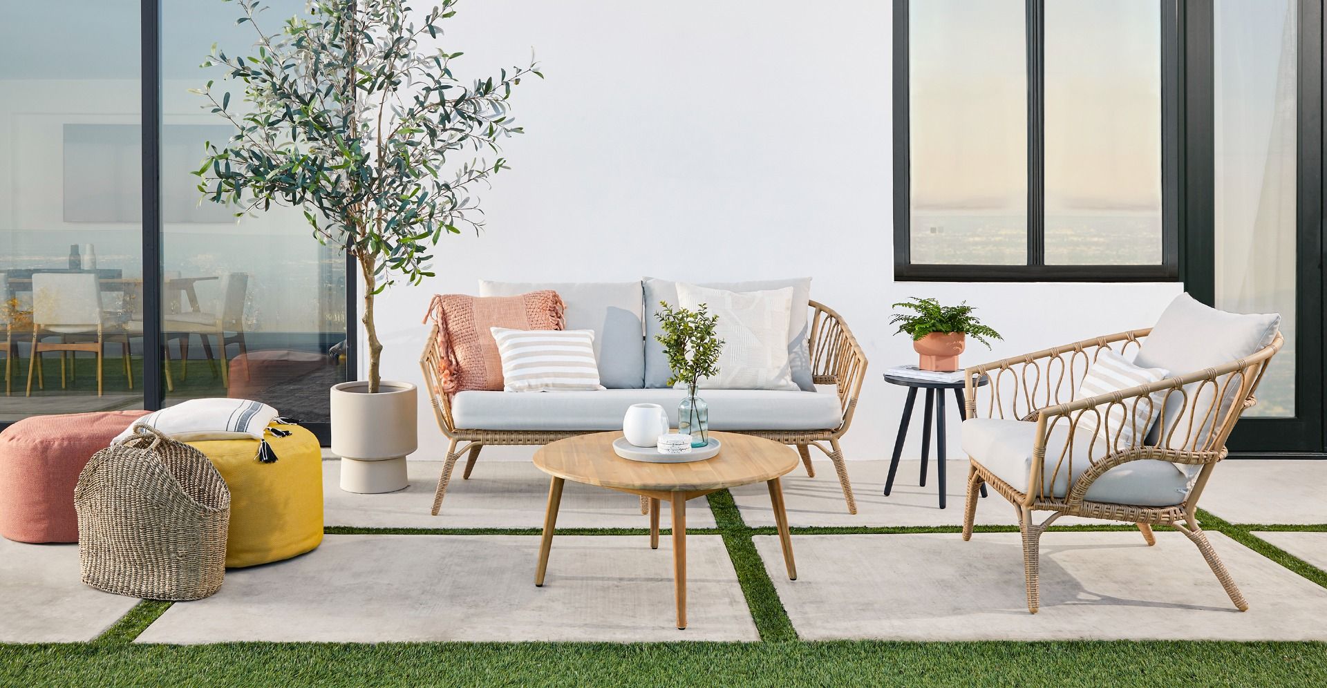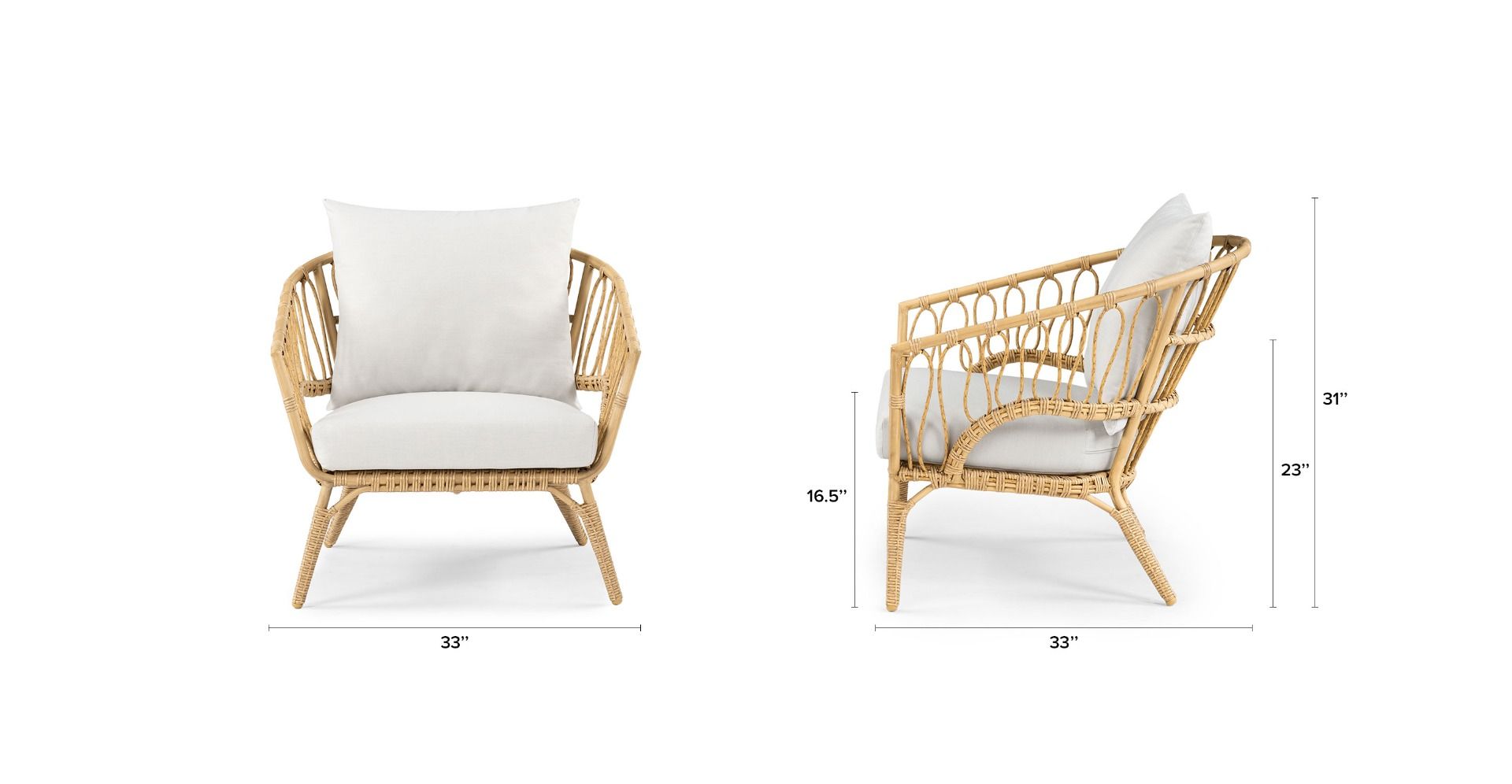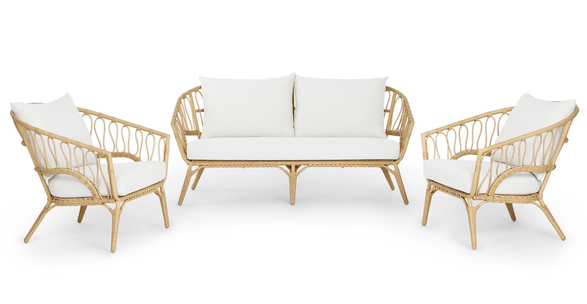 With their distinct diamond-inspired pattern, the rattan MAKO Sofa and matching lounge chairs ensure this outdoor set stands out in a crowd. Along with the plush ivory cushions, the natural-look rattan is weather-resistant and made to withstand the elements — even if you aren’t.