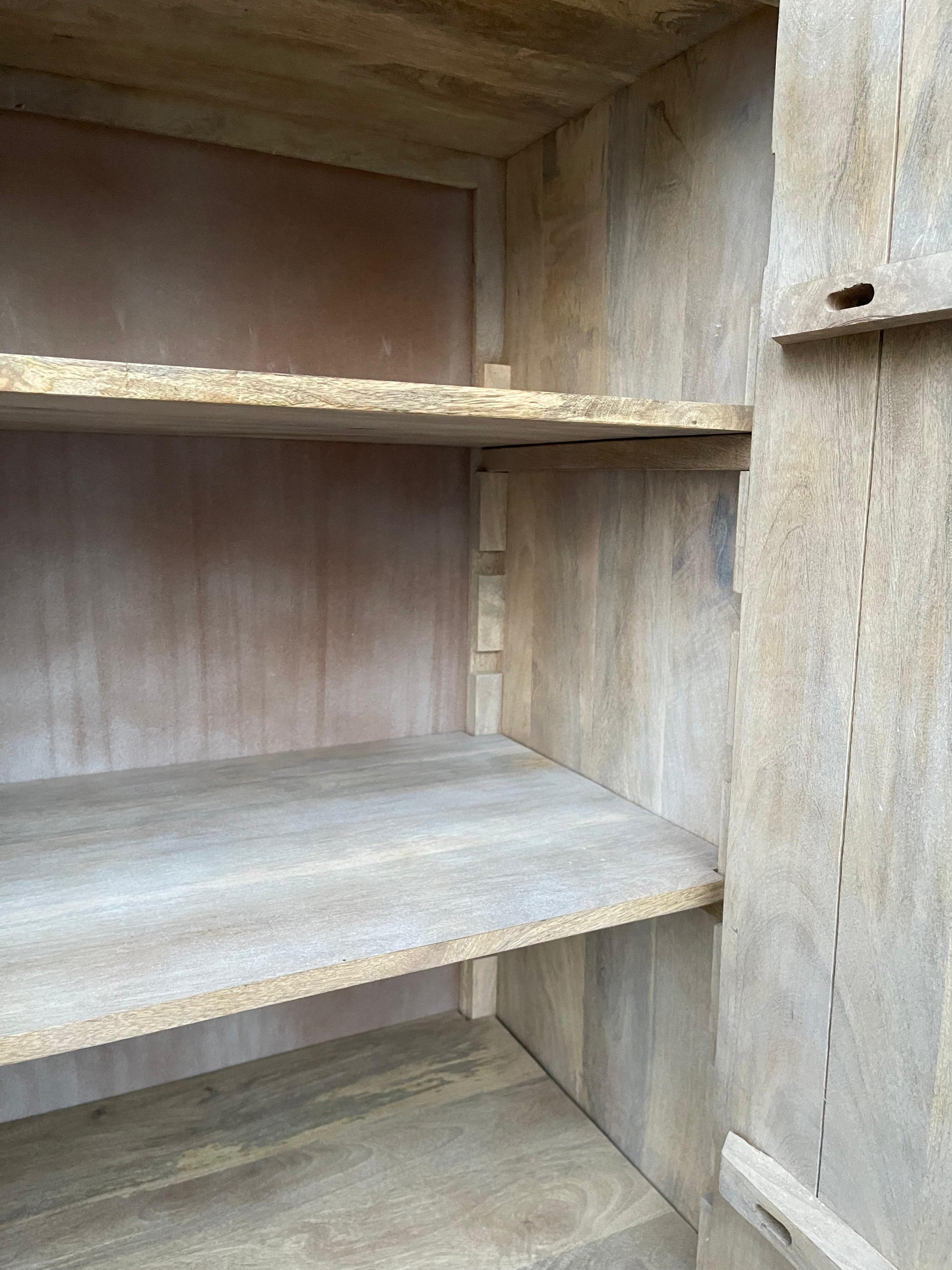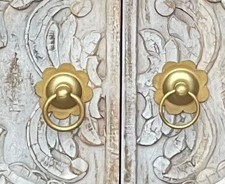 Bring this freestanding cabinet into your home and control your clutter in style! Hand-carved details embellish the cabinet's double doors, which open to reveal shelved storage to effortlessly organize your household essentials. Displaying the well-traveled refinement of an antique, this tall cabinet features decorative twin doors with ring pulls that open to three shelved compartments. This exclusive statement piece keeps everything, from dishes and drinkware to board games, organized and out of sight.